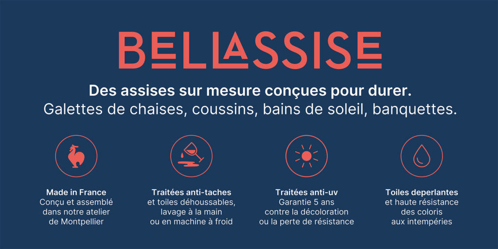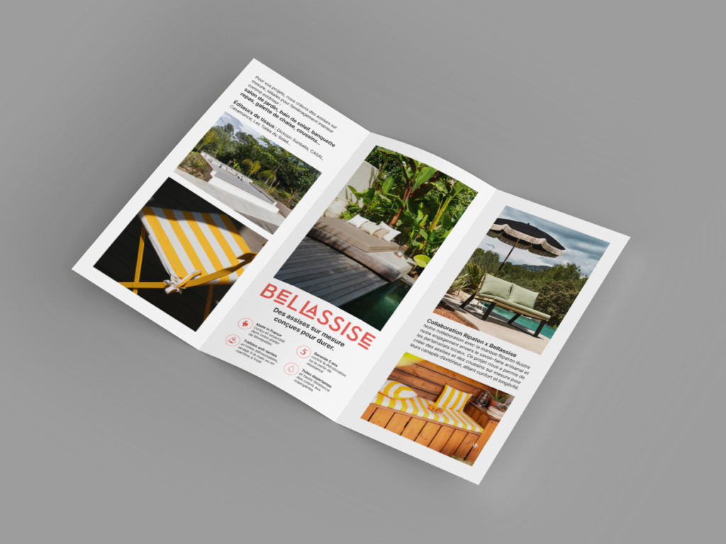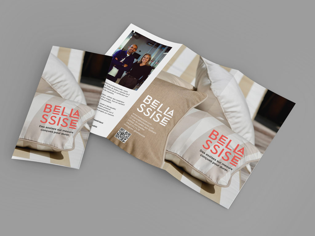 Conception graphique du logo Bellassise, d’une brochure 3 volets et de l’identité du site internet. Confection d’assises et de coussins sur mesure: bellassise.com