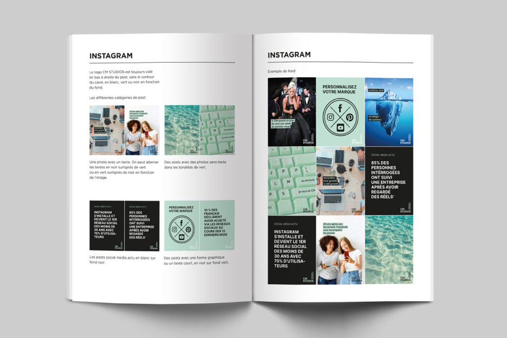 Conception d’une identité visuelle pour CM studios, Community Management. Logo, brochure, identité visuelle Instagram.